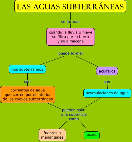 Este Cmap, tiene información relacionada con: Las aguas subterráneas, cuando la lluvia o nieve se filtra por la tierra y se almacena puede formar ríos subterráneos, LAS AGUAS SUBTERRÁNEAS se forman cuando la lluvia o nieve se filtra por la tierra y se almacena, corrientes de agua que corren por el interior de las cuevas subterráneas pueden salir a la superficie como pozos, acuíferos son acumulaciones de agua, corrientes de agua que corren por el interior de las cuevas subterráneas pueden salir a la superficie como fuentes o manantiales, acumulaciones de agua pueden salir a la superficie como fuentes o manantiales, ríos subterráneos son corrientes de agua que corren por el interior de las cuevas subterráneas, acumulaciones de agua pueden salir a la superficie como pozos, cuando la lluvia o nieve se filtra por la tierra y se almacena puede formar acuíferos