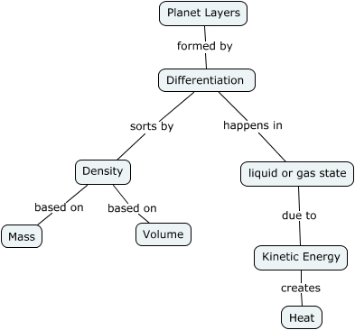 This Concept Map, created with IHMC CmapTools, has information related to: Planet Layers, liquid or gas state due to Kinetic Energy, Planet Layers formed by Differentiation, Differentiation happens in liquid or gas state, Kinetic Energy creates Heat, Differentiation sorts by Density, Density based on Mass, Density based on Volume