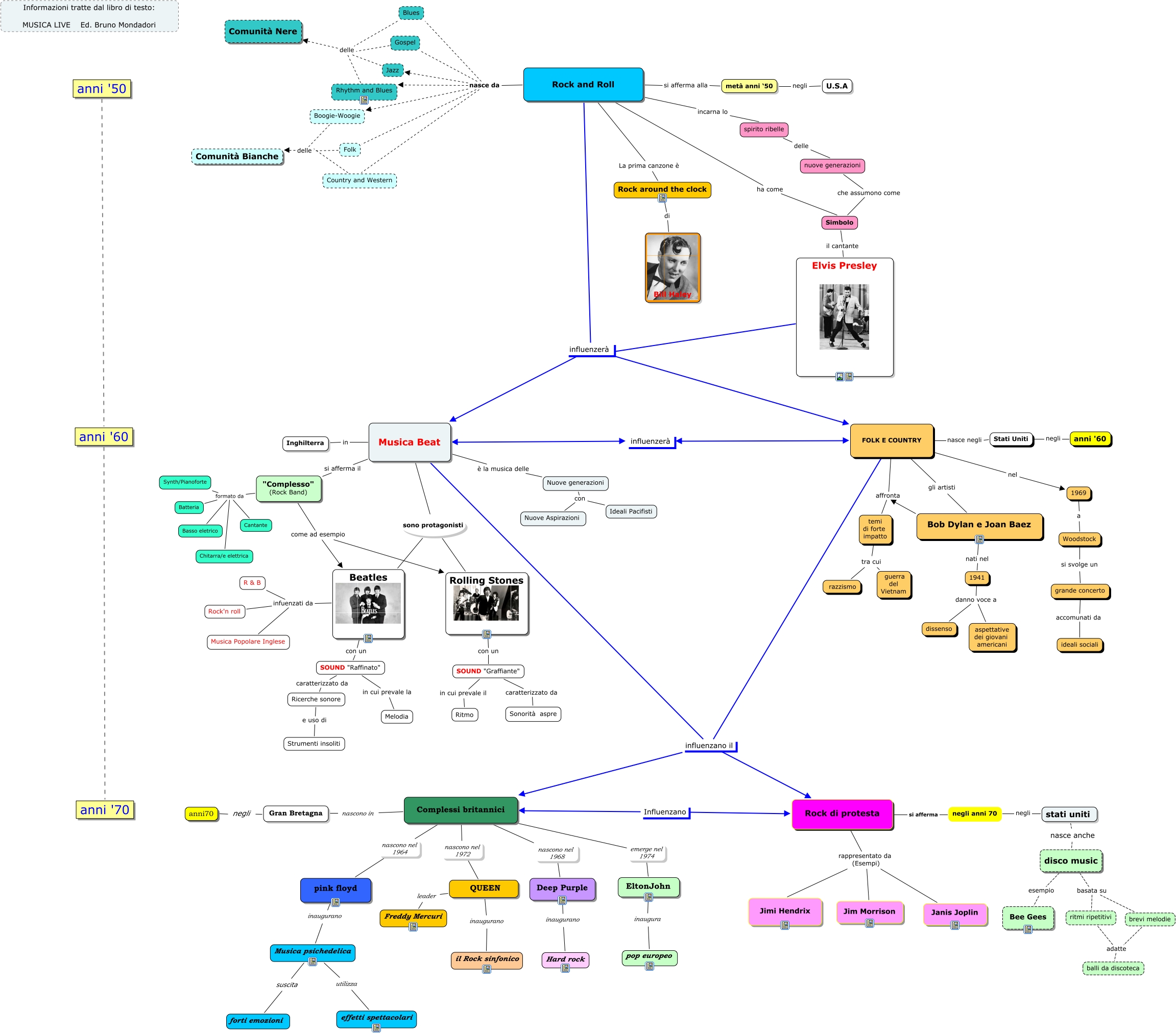 Questa Cmap, creata con IHMC CmapTools, contiene informazioni relative a: ML Storia del Rock anni 50 60 70, "Complesso" (Rock Band) formato da Chitarra/e elettrica, EltonJohn inaugura pop europeo, Ricerche sonore e uso di Strumenti insoliti, Country and Western delle Comunità Bianche, Beatles con un SOUND "Raffinato", FOLK E COUNTRY nel 1969, "Complesso" (Rock Band) formato da Synth/Pianoforte, Musica Beat è la musica delle Nuove generazioni, nuove generazioni che assumono come Simbolo, QUEEN leader Freddy Mercuri, pink floyd inaugurano Musica psichedelica, Musica Beat in Inghilterra, Elvis Presley influenzerà Musica Beat, Gospel delle Comunità Nere, FOLK E COUNTRY affronta temi di forte impatto, Complessi britannici nascono in Gran Bretagna, spirito ribelle delle nuove generazioni, Gran Bretagna negli anni70, Complessi britannici nascono nel 1968 Deep Purple, Rock and Roll nasce da Country and Western