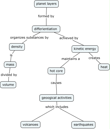 This Concept Map, created with IHMC CmapTools, has information related to: Planet layers, differientiation achieved by kinetic energy, geoogical activities which includes volcanoes, hot core causes geoogical activities, kinetic energy maintains a hot core, density is mass, kinetic energy creates heat, geoogical activities which includes earthquakes, planet layers formed by differientiation, differientiation organizes substances by density, mass divided by volume