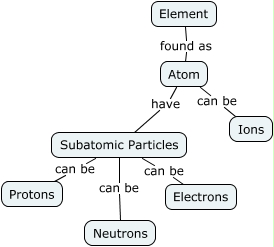 This Concept Map, created with IHMC CmapTools, has information related to: Atom Cmap, Element found as Atom, Atom have Subatomic Particles, Subatomic Particles can be Protons, Subatomic Particles can be Electrons, Subatomic Particles can be Neutrons, Atom can be Ions