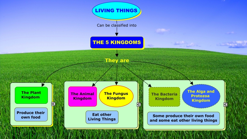 This Concept Map, created with IHMC CmapTools, has information related to: Living Things, THE 5 KINGDOMS They are The Alga and Protozoa Kingdom, THE 5 KINGDOMS They are The Fungus Kingdom, LIVING THINGS Can be classified into THE 5 KINGDOMS, THE 5 KINGDOMS They are The Bacteria Kingdom, THE 5 KINGDOMS They are The Animal Kingdom, THE 5 KINGDOMS They are The Plant Kingdom
