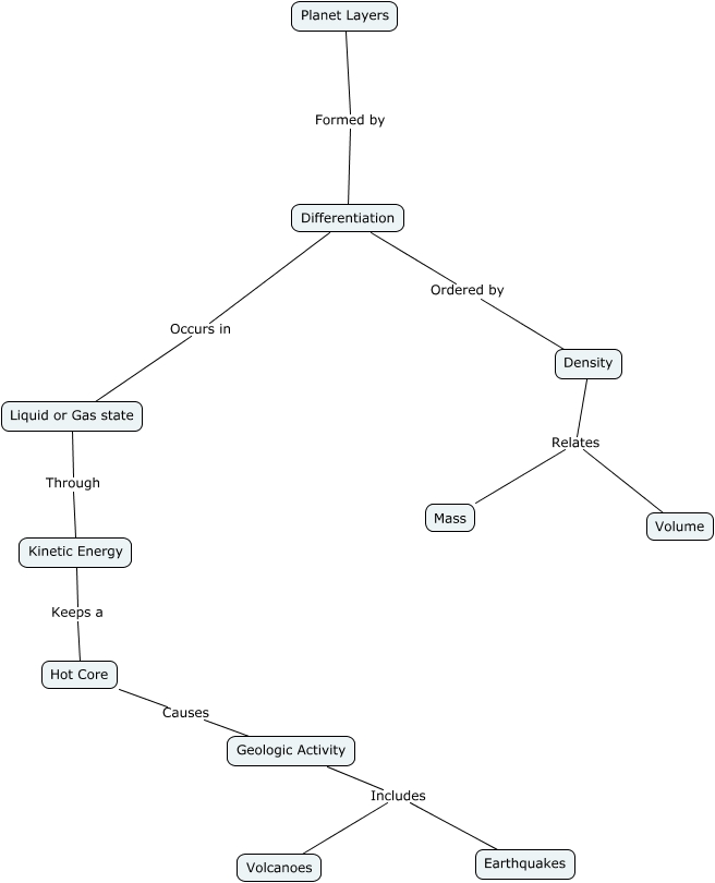 This Concept Map, created with IHMC CmapTools, has information related to: Planet Layers, Liquid or Gas state Through Kinetic Energy, Differentiation Occurs in Liquid or Gas state, Planet Layers Formed by Differentiation, Geologic Activity Includes Volcanoes, Hot Core Causes Geologic Activity, Kinetic Energy Keeps a Hot Core, Geologic Activity Includes Earthquakes, Density Relates Volume, Density Relates Mass, Differentiation Ordered by Density