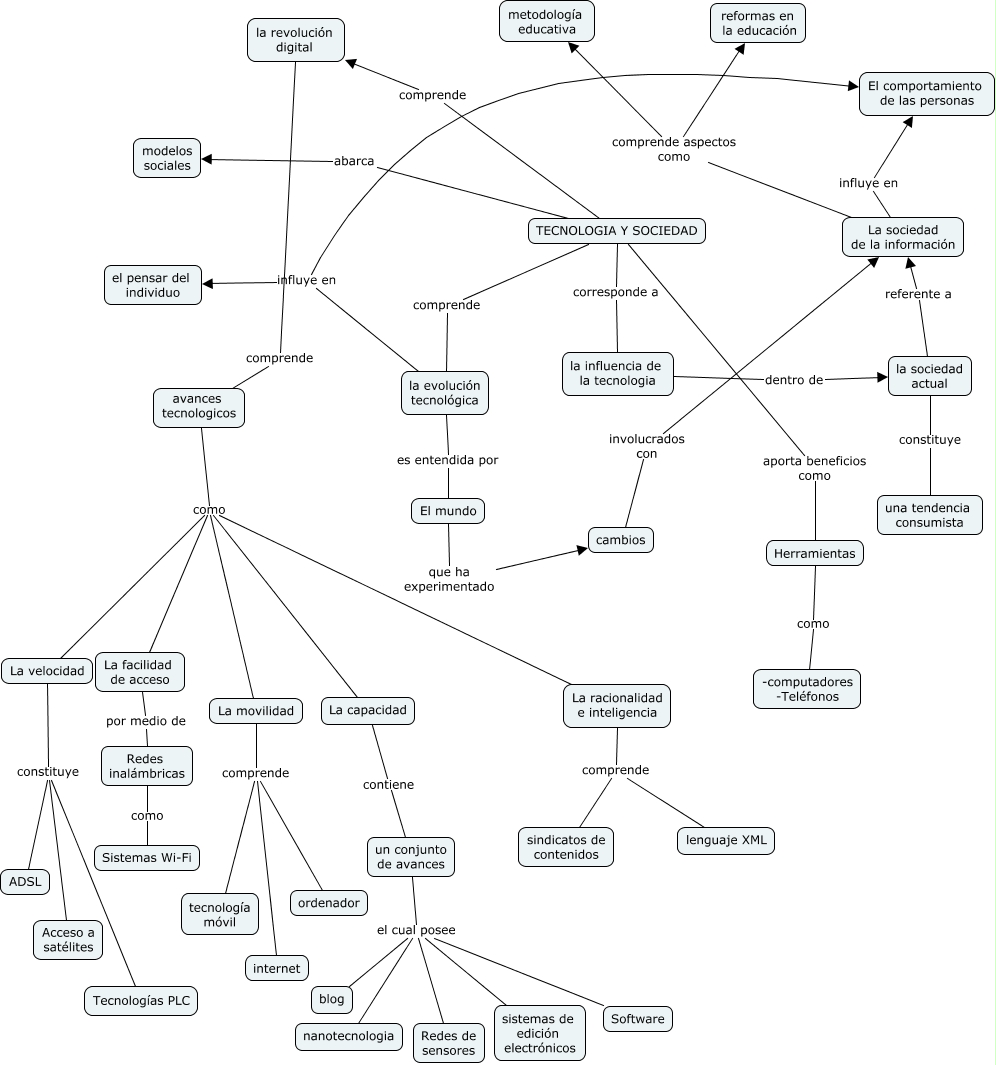 Este Cmap, tiene información relacionada con: tecnologia y sociedad, La movilidad comprende tecnología móvil, la evolución tecnológica es entendida por El mundo, avances tecnologicos como La movilidad, La sociedad de la información influye en El comportamiento de las personas, la influencia de la tecnologia dentro de la sociedad actual, un conjunto de avances el cual posee blog, avances tecnologicos como La capacidad, La movilidad comprende ordenador, cambios involucrados con La sociedad de la información, avances tecnologicos como La racionalidad e inteligencia, un conjunto de avances el cual posee Software, un conjunto de avances el cual posee Redes de sensores, avances tecnologicos como La facilidad de acceso, la revolución digital comprende avances tecnologicos, TECNOLOGIA Y SOCIEDAD aporta beneficios como Herramientas, avances tecnologicos como La velocidad, Herramientas como -computadores -Teléfonos, un conjunto de avances el cual posee nanotecnologia, La velocidad constituye Tecnologías PLC, La velocidad constituye ADSL
