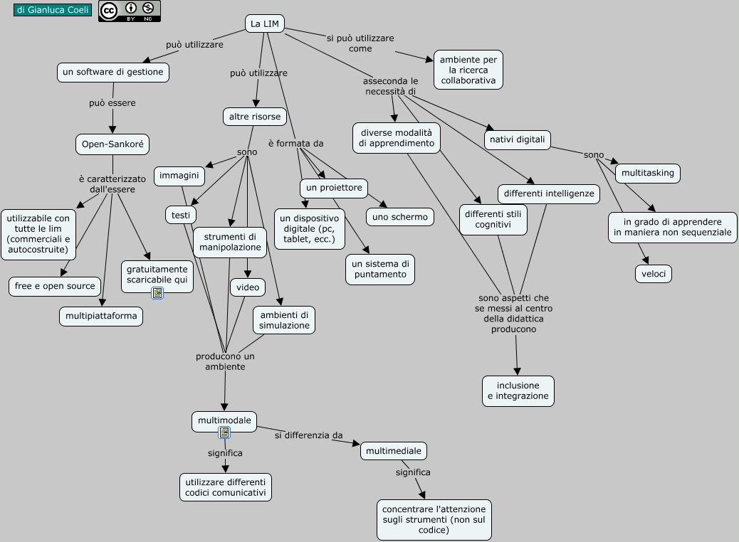 Questa Cmap, creata con IHMC CmapTools, contiene informazioni relative a: lim cle, un software di gestione può essere Open-Sankoré, multimodale si differenzia da multimediale, Open-Sankoré è caratterizzato dall'essere free e open source, strumenti di manipolazione producono un ambiente multimodale, altre risorse sono immagini, La LIM è formata da un dispositivo digitale (pc, tablet, ecc.), immagini producono un ambiente multimodale, differenti stili cognitivi sono aspetti che se messi al centro della didattica producono inclusione e integrazione, La LIM asseconda le necessità di differenti intelligenze, diverse modalità di apprendimento sono aspetti che se messi al centro della didattica producono inclusione e integrazione, Open-Sankoré è caratterizzato dall'essere utilizzabile con tutte le lim (commerciali e autocostruite), La LIM è formata da uno schermo, multimediale significa concentrare l'attenzione sugli strumenti (non sul codice), La LIM è formata da un proiettore, video producono un ambiente multimodale, altre risorse sono ambienti di simulazione, La LIM si può utilizzare come ambiente per la ricerca collaborativa, La LIM può utilizzare altre risorse, altre risorse sono testi, Open-Sankoré è caratterizzato dall'essere multipiattaforma