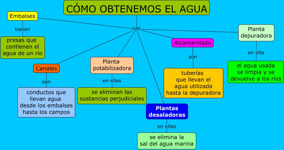 Este Cmap, tiene información relacionada con: Cómo obtenemos el agua, CÓMO OBTENEMOS EL AGUA con Alcantarillado, Canales son conductos que llevan agua desde los embalses hasta los campos, CÓMO OBTENEMOS EL AGUA con Canales, Embalses tienen presas que contienen el agua de un río, Alcantarillado son tuberías que llevan el agua utilizada hasta la depuradora, CÓMO OBTENEMOS EL AGUA con Planta depuradora, Planta depuradora en ella el agua usada se limpia y se devuelve a los ríos, Planta potabilizadora en ellas se eliminan las sustancias perjudiciales, CÓMO OBTENEMOS EL AGUA con Plantas desaladoras, CÓMO OBTENEMOS EL AGUA con Embalses, CÓMO OBTENEMOS EL AGUA con Planta potabilizadora, Plantas desaladoras en ellas se elimina la sal del agua marina