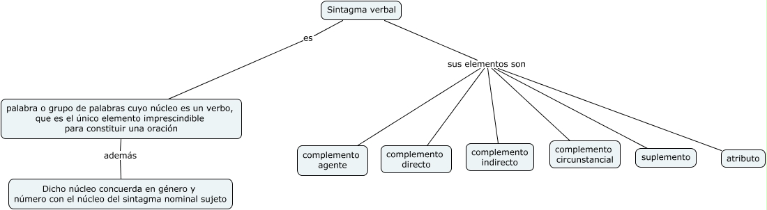 Este Cmap, tiene información relacionada con: sintagma verbal, Sintagma verbal sus elementos son complemento circunstancial, Sintagma verbal sus elementos son complemento directo, Sintagma verbal sus elementos son complemento indirecto, palabra o grupo de palabras cuyo núcleo es un verbo, que es el único elemento imprescindible para constituir una oración además Dicho núcleo concuerda en género y número con el núcleo del sintagma nominal sujeto, Sintagma verbal sus elementos son atributo, Sintagma verbal sus elementos son complemento agente, Sintagma verbal es palabra o grupo de palabras cuyo núcleo es un verbo, que es el único elemento imprescindible para constituir una oración, Sintagma verbal sus elementos son suplemento