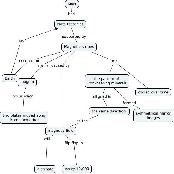 This Concept Map, created with IHMC CmapTools, has information related to: Plate Tectonics on Mars, Magnetic stripes are the pattern of iron-bearing minerals, the pattern of iron-bearing minerals formed symmetrical mirror images, magma occur when two plates moved away from each other, Mars had Plate tectonics, Plate tectonics supported by Magnetic stripes, magnetic field filp flop in every 10,000, magnetic field will alternate, the same direction as the magnetic field, Magnetic stripes are in magma, Magnetic stripes occured on Earth, the pattern of iron-bearing minerals alligned in the same direction, Magnetic stripes are cooled over time, Earth has Plate tectonics, Magnetic stripes caused by magnetic field