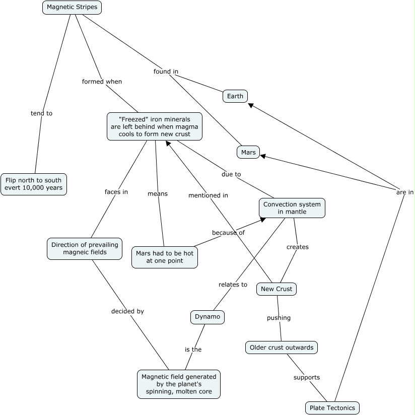 This Concept Map, created with IHMC CmapTools, has information related to: Tectonic Mars, Magnetic Stripes found in Earth, "Freezed" iron minerals are left behind when magma cools to form new crust means Mars had to be hot at one point, Direction of prevailing magneic fields decided by Magnetic field generated by the planet's spinning, molten core, Plate Tectonics are in Earth, Mars had to be hot at one point because of Convection system in mantle, Dynamo is the Magnetic field generated by the planet's spinning, molten core, "Freezed" iron minerals are left behind when magma cools to form new crust due to Convection system in mantle, "Freezed" iron minerals are left behind when magma cools to form new crust faces in Direction of prevailing magneic fields, Magnetic Stripes tend to Flip north to south evert 10,000 years, Magnetic Stripes found in Mars, Convection system in mantle creates New Crust, New Crust mentioned in "Freezed" iron minerals are left behind when magma cools to form new crust, New Crust pushing Older crust outwards, Magnetic Stripes formed when "Freezed" iron minerals are left behind when magma cools to form new crust, Convection system in mantle relates to Dynamo, Plate Tectonics are in Mars, Older crust outwards supports Plate Tectonics