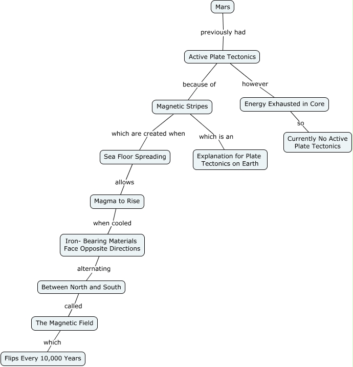 This Concept Map, created with IHMC CmapTools, has information related to: Mars Magnetic Stripes, Between North and South called The Magnetic Field, Energy Exhausted in Core so Currently No Active Plate Tectonics, Mars previously had Active Plate Tectonics, Active Plate Tectonics because of Magnetic Stripes, The Magnetic Field which Flips Every 10,000 Years, Magma to Rise when cooled Iron- Bearing Materials Face Opposite Directions, Sea Floor Spreading allows Magma to Rise, Active Plate Tectonics however Energy Exhausted in Core, Magnetic Stripes which is an Explanation for Plate Tectonics on Earth, Magnetic Stripes which are created when Sea Floor Spreading, Iron- Bearing Materials Face Opposite Directions alternating Between North and South