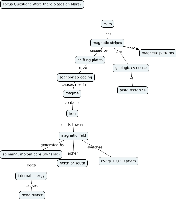 This Concept Map, created with IHMC CmapTools, has information related to: Mars Plate Tectonics, Mars has magnetic stripes, iron shifts toward magnetic field, magma contains iron, internal energy causes dead planet, magnetic stripes are geologic evidence, shifting plates allow seafloor spreading, magnetic field generated by spinning, molten core (dynamo), magnetic stripes caused by shifting plates, spinning, molten core (dynamo) loses internal energy, seafloor spreading causes rise in magma, geologic evidence of plate tectonics, magnetic field switches every 10,000 years, magnetic field either north or south, magnetic stripes are magnetic patterns