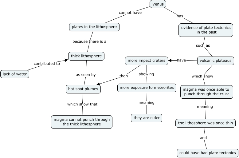 This Concept Map, created with IHMC CmapTools, has information related to: Tectonic Venus, lack of water contributed to thick lithosphere, more impact craters than hot spot plumes, more impact craters showing more exposure to meteorites, volcanic plateaus have more impact craters, evidence of plate tectonics in the past such as volcanic plateaus, magma was once able to punch through the crust meaning the lithosphere was once thin, volcanic plateaus which show magma was once able to punch through the crust, hot spot plumes which show that magma cannot punch through the thick lithosphere, more exposure to meteorites meaning they are older, Venus has evidence of plate tectonics in the past, plates in the lithosphere because there is a thick lithosphere, Venus cannot have plates in the lithosphere, thick lithosphere as seen by hot spot plumes, the lithosphere was once thin and could have had plate tectonics