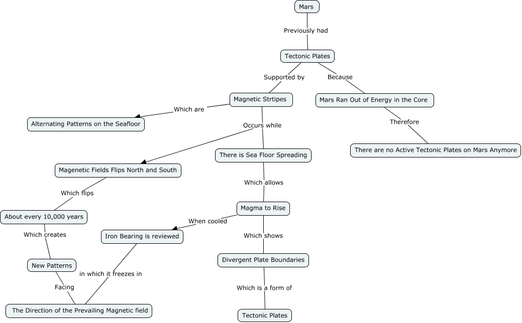 This Concept Map, created with IHMC CmapTools, has information related to: Tectonic Plates on Mars, Magma to Rise When cooled Iron Bearing is reviewed, Magenetic Fields Flips North and South Which flips About every 10,000 years, Magma to Rise Which shows Divergent Plate Boundaries, Magnetic Strtipes Occurs while There is Sea Floor Spreading, Iron Bearing is reviewed in which it freezes in The Direction of the Prevailing Magnetic field, There is Sea Floor Spreading Which allows Magma to Rise, About every 10,000 years Which creates New Patterns, Divergent Plate Boundaries Which is a form of Tectonic Plates, Magnetic Strtipes Occurs while Magenetic Fields Flips North and South, Mars Previously had Tectonic Plates, Tectonic Plates Because Mars Ran Out of Energy in the Core, Magnetic Strtipes Which are Alternating Patterns on the Seafloor, New Patterns Facing The Direction of the Prevailing Magnetic field, Mars Ran Out of Energy in the Core Therefore There are no Active Tectonic Plates on Mars Anymore, Tectonic Plates Supported by Magnetic Strtipes