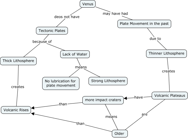 This Concept Map, created with IHMC CmapTools, has information related to: Tectonic Venus, Older than Volcanic Rises, Venus deos not have Tectonic Plates, Lack of Water means Strong Lithosphere, Volcanic Plateaus have more impact craters, more impact craters means Older, Venus may have had Plate Movement in the past, Tectonic Plates because of Thick Lithosphere, Thick Lithosphere creates Volcanic Rises, Lack of Water means No lubrication for plate movement, Plate Movement in the past due to Thinner Lithosphere, Thinner Lithosphere creates Volcanic Plateaus, Volcanic Plateaus are Older, more impact craters than Volcanic Rises, Tectonic Plates because of Lack of Water
