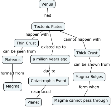 This Concept Map, created with IHMC CmapTools, has information related to: Tectonic Plates on Venus, Tectonic Plates happen with Thin Crust, Magma Bulges form when Magma cannot pass through, Plateaus formed from Magma, Thick Crust can be shown from Magma Bulges, Venus had Tectonic Plates, a milion years ago due to Catastrophic Event, Catastrophic Event resurfaced Planet, Thin Crust can be seen from Plateaus, Tectonic Plates existed up to a milion years ago, Tectonic Plates cannot happen with Thick Crust