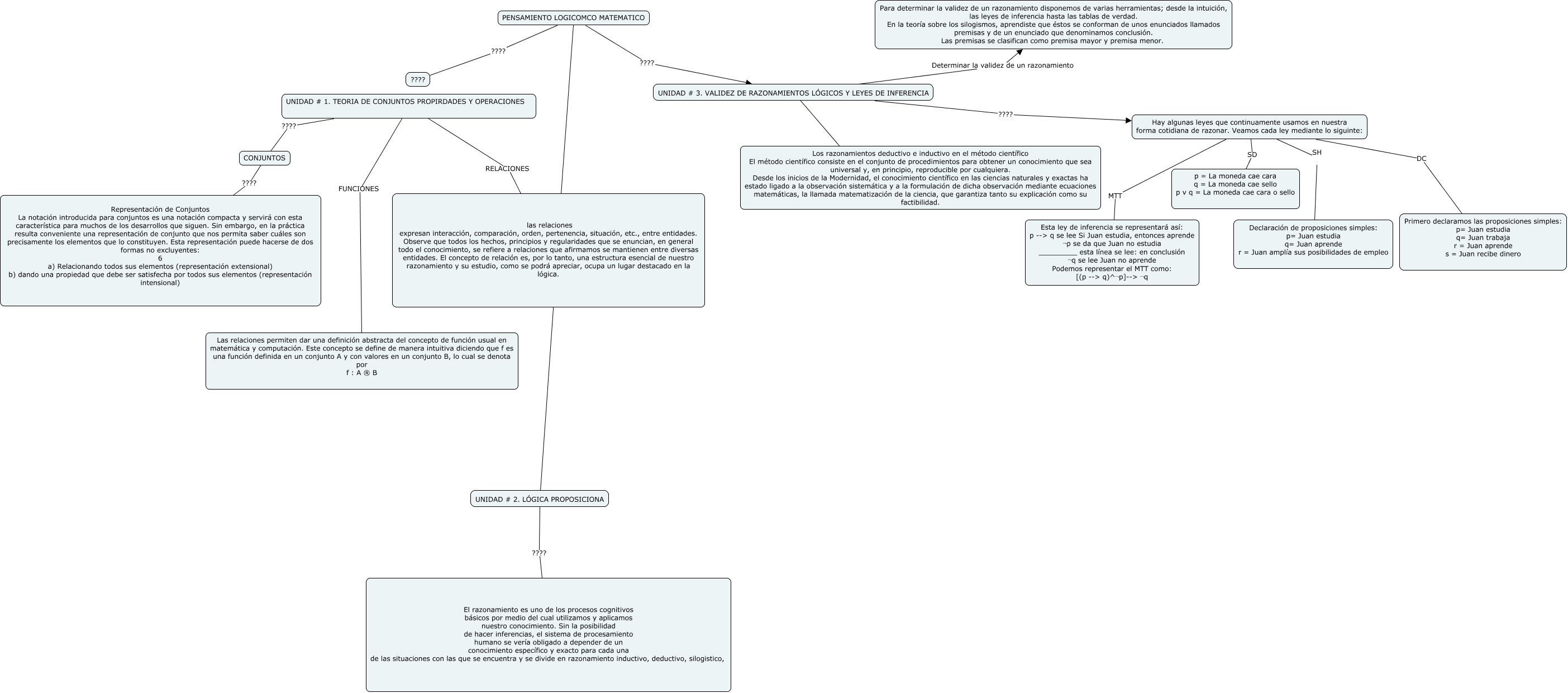Este Cmap, tiene información relacionada con: aleja, PENSAMIENTO LOGICOMCO MATEMATICO ???? ????, Hay algunas leyes que continuamente usamos en nuestra forma cotidiana de razonar. Veamos cada ley mediante lo siguinte: MTT Esta ley de inferencia se representará así: p --> q se lee Si Juan estudia, entonces aprende ¬p se da que Juan no estudia _________ esta línea se lee: en conclusión ¬q se lee Juan no aprende Podemos representar el MTT como: [(p --> q)^¬p]--> ¬q, UNIDAD # 1. TEORIA DE CONJUNTOS PROPIRDADES Y OPERACIONES RELACIONES las relaciones expresan interacción, comparación, orden, pertenencia, situación, etc., entre entidades. Observe que todos los hechos, principios y regularidades que se enuncian, en general todo el conocimiento, se refiere a relaciones que afirmamos se mantienen entre diversas entidades. El concepto de relación es, por lo tanto, una estructura esencial de nuestro razonamiento y su estudio, como se podrá apreciar, ocupa un lugar destacado en la lógica., PENSAMIENTO LOGICOMCO MATEMATICO ???? UNIDAD # 3. VALIDEZ DE RAZONAMIENTOS LÓGICOS Y LEYES DE INFERENCIA, UNIDAD # 1. TEORIA DE CONJUNTOS PROPIRDADES Y OPERACIONES ???? CONJUNTOS, Hay algunas leyes que continuamente usamos en nuestra forma cotidiana de razonar. Veamos cada ley mediante lo siguinte: SH Declaración de proposiciones simples: p= Juan estudia q= Juan aprende r = Juan amplía sus posibilidades de empleo, UNIDAD # 2. LÓGICA PROPOSICIONA ???? El razonamiento es uno de los procesos cognitivos básicos por medio del cual utilizamos y aplicamos nuestro conocimiento. Sin la posibilidad de hacer inferencias, el sistema de procesamiento humano se vería obligado a depender de un conocimiento específico y exacto para cada una de las situaciones con las que se encuentra y se divide en razonamiento inductivo, deductivo, silogistico,, UNIDAD # 1. TEORIA DE CONJUNTOS PROPIRDADES Y OPERACIONES FUNCIONES Las relaciones permiten dar una definición abstracta del concepto de función usual en matemática y computación. Este concepto se define de manera intuitiva diciendo que f es una función definida en un conjunto A y con valores en un conjunto B, lo cual se denota por f : A ® B, Hay algunas leyes que continuamente usamos en nuestra forma cotidiana de razonar. Veamos cada ley mediante lo siguinte: SD p = La moneda cae cara q = La moneda cae sello p v q = La moneda cae cara o sello, Hay algunas leyes que continuamente usamos en nuestra forma cotidiana de razonar. Veamos cada ley mediante lo siguinte: DC Primero declaramos las proposiciones simples: p= Juan estudia q= Juan trabaja r = Juan aprende s = Juan recibe dinero, UNIDAD # 3. VALIDEZ DE RAZONAMIENTOS LÓGICOS Y LEYES DE INFERENCIA ???? Hay algunas leyes que continuamente usamos en nuestra forma cotidiana de razonar. Veamos cada ley mediante lo siguinte:, UNIDAD # 3. VALIDEZ DE RAZONAMIENTOS LÓGICOS Y LEYES DE INFERENCIA Determinar la validez de un razonamiento Para determinar la validez de un razonamiento disponemos de varias herramientas; desde la intuición, las leyes de inferencia hasta las tablas de verdad. En la teoría sobre los silogismos, aprendiste que éstos se conforman de unos enunciados llamados premisas y de un enunciado que denominamos conclusión. Las premisas se clasifican como premisa mayor y premisa menor., CONJUNTOS ???? Representación de Conjuntos La notación introducida para conjuntos es una notación compacta y servirá con esta característica para muchos de los desarrollos que siguen. Sin embargo, en la práctica resulta conveniente una representación de conjunto que nos permita saber cuáles son precisamente los elementos que lo constituyen. Esta representación puede hacerse de dos formas no excluyentes: 6 a) Relacionando todos sus elementos (representación extensional) b) dando una propiedad que debe ser satisfecha por todos sus elementos (representación intensional), PENSAMIENTO LOGICOMCO MATEMATICO ???? UNIDAD # 2. LÓGICA PROPOSICIONA, UNIDAD # 3. VALIDEZ DE RAZONAMIENTOS LÓGICOS Y LEYES DE INFERENCIA ???? Los razonamientos deductivo e inductivo en el método científico El método científico consiste en el conjunto de procedimientos para obtener un conocimiento que sea universal y, en principio, reproducible por cualquiera. Desde los inicios de la Modernidad, el conocimiento científico en las ciencias naturales y exactas ha estado ligado a la observación sistemática y a la formulación de dicha observación mediante ecuaciones matemáticas, la llamada matematización de la ciencia, que garantiza tanto su explicación como su factibilidad.