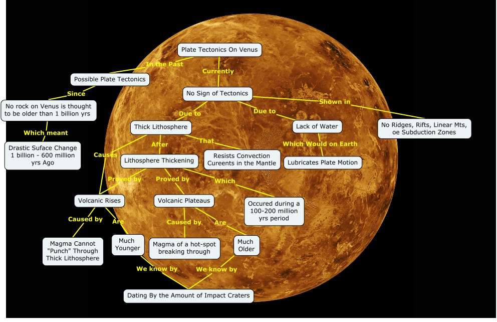 This Concept Map, created with IHMC CmapTools, has information related to: Tectonic Venus, Plate Tectonics On Venus Currently No Sign of Tectonics, Lithosphere Thickening Proved by Volcanic Rises, Volcanic Rises Caused by Magma Cannot "Punch" Through Thick Lithosphere, Much Older We know by Dating By the Amount of Impact Craters, No Sign of Tectonics Due to Lack of Water, Lithosphere Thickening Which Occured during a 100-200 million yrs period, Thick Lithosphere After Lithosphere Thickening, Lithosphere Thickening Proved by Volcanic Plateaus, Thick Lithosphere That Resists Convection Cureents in the Mantle, Lack of Water Which Would on Earth Lubricates Plate Motion, No Sign of Tectonics Due to Thick Lithosphere, No rock on Venus is thought to be older than 1 billion yrs Which meant Drastic Suface Change 1 billion - 600 million yrs Ago, Volcanic Plateaus Are Much Older, Possible Plate Tectonics Since No rock on Venus is thought to be older than 1 billion yrs, Much Younger We know by Dating By the Amount of Impact Craters, Thick Lithosphere Causes Volcanic Rises, No Sign of Tectonics Shown in No Ridges, Rifts, Linear Mts, oe Subduction Zones, Volcanic Plateaus Caused by Magma of a hot-spot breaking through, Volcanic Rises Are Much Younger, Plate Tectonics On Venus In the Past Possible Plate Tectonics