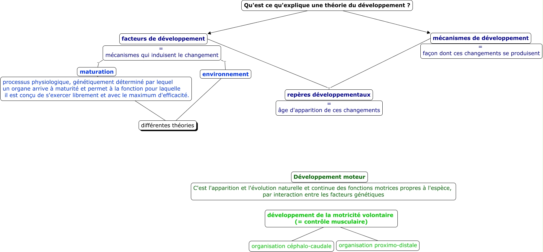 Cette carte de concepts créée avec IHMC CmapTools traite de: Développement moteur, environnement ???? différentes théories, facteurs de développement - repères développementaux, Qu'est ce qu'explique une théorie du développement ? - mécanismes de développement, mécanismes de développement - repères développementaux, développement de la motricité volontaire (= contrôle musculaire) ???? organisation céphalo-caudale, développement de la motricité volontaire (= contrôle musculaire) ???? organisation proximo-distale, maturation ???? différentes théories, = mécanismes qui induisent le changement - environnement, = mécanismes qui induisent le changement - maturation, Qu'est ce qu'explique une théorie du développement ? - facteurs de développement
