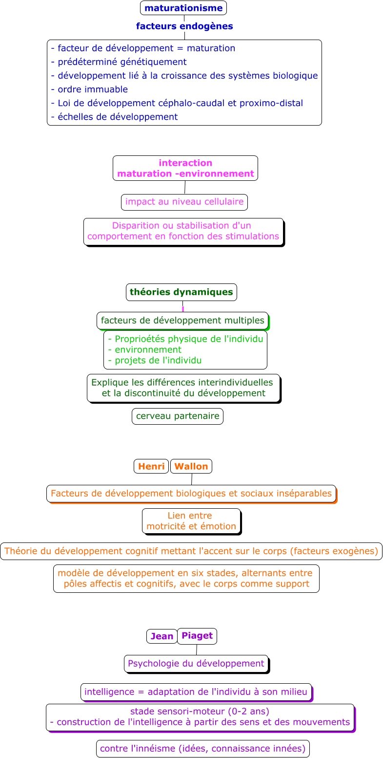 Cette carte de concepts créée avec IHMC CmapTools traite de: différentes théories du développement, maturationisme facteurs endogènes - facteur de développement = maturation - prédéterminé génétiquement - développement lié à la croissance des systèmes biologique - ordre immuable - Loi de développement céphalo-caudal et proximo-distal - échelles de développement, Wallon l Facteurs de développement biologiques et sociaux inséparables, interaction maturation -environnement l impact au niveau cellulaire, Piaget l Psychologie du développement, théories dynamiques l facteurs de développement multiples