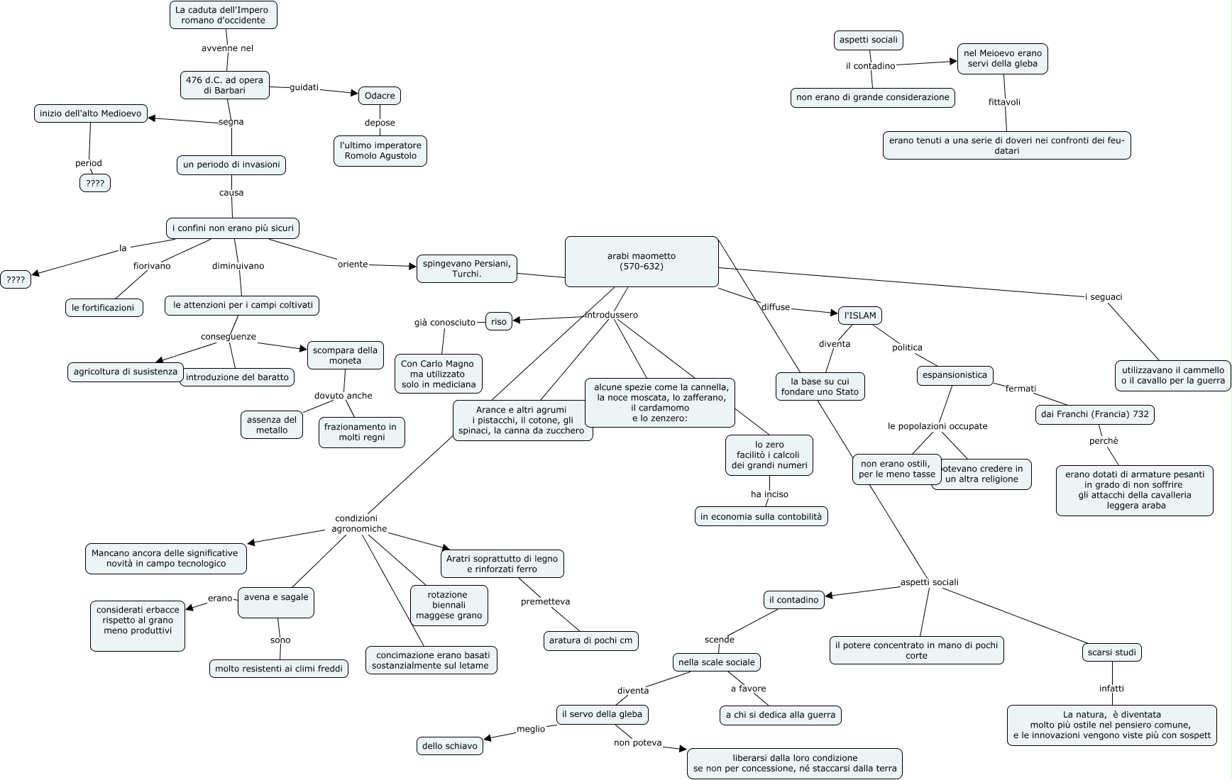 Questa Cmap, creata con IHMC CmapTools, contiene informazioni relative a: arabi, arabi maometto (570-632) introdussero Arance e altri agrumi i pistacchi, il cotone, gli spinaci, la canna da zucchero, arabi maometto (570-632) introdussero riso, il contadino scende nella scale sociale, espansionistica le popolazioni occupate non erano ostili, per le meno tasse, il servo della gleba meglio dello schiavo, aspetti sociali il contadino non erano di grande considerazione, 476 d.C. ad opera di Barbari segna un periodo di invasioni, arabi maometto (570-632) aspetti sociali scarsi studi, nella scale sociale a favore a chi si dedica alla guerra, avena e sagale condizioni agronomiche Aratri soprattutto di legno e rinforzati ferro, arabi maometto (570-632) condizioni agronomiche Aratri soprattutto di legno e rinforzati ferro, l'ISLAM diventa la base su cui fondare uno Stato, inizio dell'alto Medioevo period ????, aspetti sociali il contadino nel Meioevo erano servi della gleba, avena e sagale condizioni agronomiche Mancano ancora delle signi�?cative novità in campo tecnologico, arabi maometto (570-632) aspetti sociali il contadino, arabi maometto (570-632) aspetti sociali il potere concentrato in mano di pochi corte, il servo della gleba non poteva liberarsi dalla loro condizione se non per concessione, né staccarsi dalla terra, i confini non erano più sicuri diminuivano le attenzioni per i campi coltivati, arabi maometto (570-632) i seguaci utilizzavano il cammello o il cavallo per la guerra