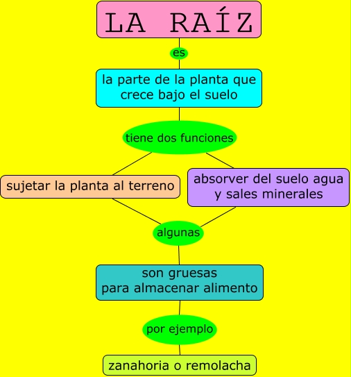 Este Cmap, tiene información relacionada con: La raíz, sujetar la planta al terreno algunas son gruesas para almacenar alimento, la parte de la planta que crece bajo el suelo tiene dos funciones sujetar la planta al terreno, absorver del suelo agua y sales minerales algunas son gruesas para almacenar alimento, son gruesas para almacenar alimento por ejemplo zanahoria o remolacha, LA RAÍZ es la parte de la planta que crece bajo el suelo, la parte de la planta que crece bajo el suelo tiene dos funciones absorver del suelo agua y sales minerales