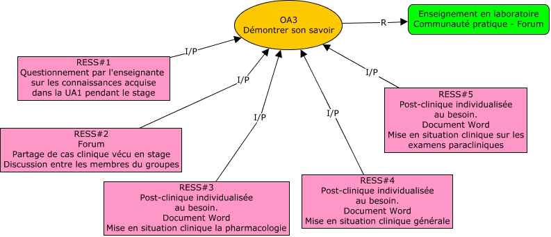 Cette carte de concepts créée avec IHMC CmapTools traite de: UA3_OA3, RESS#2 Forum Partage de cas clinique vécu en stage Discussion entre les membres du groupes I/P OA3 Démontrer son savoir, RESS#4 Post-clinique individualisée au besoin. Document Word Mise en situation clinique générale I/P OA3 Démontrer son savoir, RESS#5 Post-clinique individualisée au besoin. Document Word Mise en situation clinique sur les examens paracliniques I/P OA3 Démontrer son savoir, RESS#3 Post-clinique individualisée au besoin. Document Word Mise en situation clinique la pharmacologie I/P OA3 Démontrer son savoir, RESS#1 Questionnement par l'enseignante sur les connaissances acquise dans la UA1 pendant le stage I/P OA3 Démontrer son savoir, OA3 Démontrer son savoir R Enseignement en laboratoire Communauté pratique - Forum