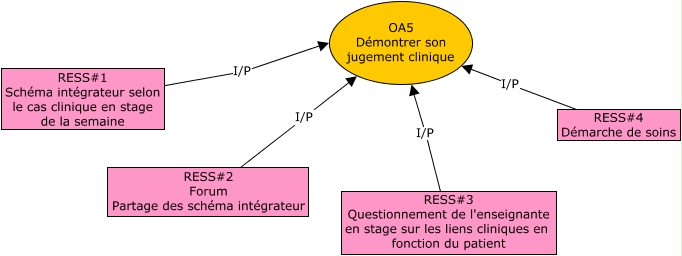 Cette carte de concepts créée avec IHMC CmapTools traite de: UA3_OA5, RESS#2 Forum Partage des schéma intégrateur I/P OA5 Démontrer son jugement clinique, RESS#1 Schéma intégrateur selon le cas clinique en stage de la semaine I/P OA5 Démontrer son jugement clinique, RESS#4 Démarche de soins I/P OA5 Démontrer son jugement clinique, RESS#3 Questionnement de l'enseignante en stage sur les liens cliniques en fonction du patient I/P OA5 Démontrer son jugement clinique