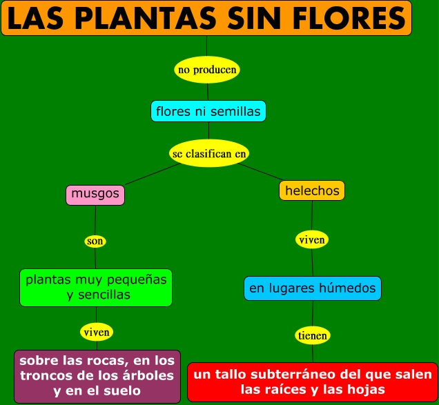 Este Cmap, tiene información relacionada con: Las plantas sin flores, LAS PLANTAS SIN FLORES no producen flores ni semillas, helechos viven en lugares húmedos, plantas muy pequeñas y sencillas viven sobre las rocas, en los troncos de los árboles y en el suelo, flores ni semillas se clasifican en musgos, en lugares húmedos tienen un tallo subterráneo del que salen las raíces y las hojas, flores ni semillas se clasifican en helechos, musgos son plantas muy pequeñas y sencillas