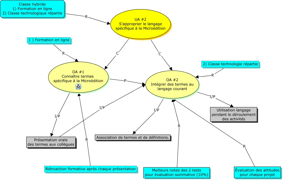 Cette carte de concepts créée avec IHMC CmapTools traite de: UA2, 2) Classe technologie répartie R OA #2 Intégrer des termes au langage courant, OA #1 Connaître termes spécifique à la Microédition P OA #2 Intégrer des termes au langage courant, Présentation orale des termes aux collègues I/P OA #2 Intégrer des termes au langage courant, Rétroaction formative après chaque présentation R OA #1 Connaître termes spécifique à la Microédition, UA #2 S'approprier le langage spécifique à la Microédition C OA #2 Intégrer des termes au langage courant, Classe hybride 1) Formation en ligne 2) Classe technologique répartie R UA #2 S'approprier le langage spécifique à la Microédition, 1 ) Formation en ligne R OA #1 Connaître termes spécifique à la Microédition, OA #2 Intégrer des termes au langage courant I/P Utilisation langage pendant le déroulement des activités, UA #2 S'approprier le langage spécifique à la Microédition C OA #1 Connaître termes spécifique à la Microédition, OA #1 Connaître termes spécifique à la Microédition I/P Présentation orale des termes aux collègues, Évaluation des attitudes pour chaque projet R OA #2 Intégrer des termes au langage courant, OA #2 Intégrer des termes au langage courant I/P Association de termes et de définitions., Meilleurs notes des 2 tests pour évaluation sommative (10%) R OA #2 Intégrer des termes au langage courant