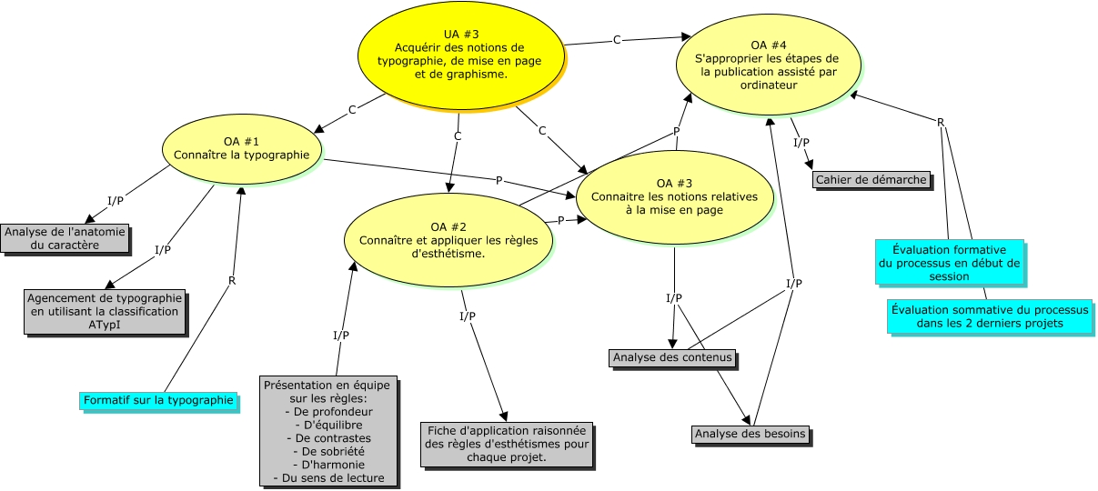 Cette carte de concepts créée avec IHMC CmapTools traite de: UA3, OA #2 Connaître et appliquer les règles d'esthétisme. P OA #3 Connaitre les notions relatives à la mise en page, OA #4 S'approprier les étapes de la publication assisté par ordinateur I/P Cahier de démarche, Présentation en équipe sur les règles: - De profondeur - D'équilibre - De contrastes - De sobriété - D'harmonie - Du sens de lecture I/P OA #2 Connaître et appliquer les règles d'esthétisme., Analyse des besoins I/P OA #4 S'approprier les étapes de la publication assisté par ordinateur, OA #1 Connaître la typographie P OA #3 Connaitre les notions relatives à la mise en page, OA #1 Connaître la typographie I/P Agencement de typographie en utilisant la classification ATypI, UA #3 Acquérir des notions de typographie, de mise en page et de graphisme. C OA #4 S'approprier les étapes de la publication assisté par ordinateur, OA #3 Connaitre les notions relatives à la mise en page P OA #4 S'approprier les étapes de la publication assisté par ordinateur, Formatif sur la typographie R OA #1 Connaître la typographie, OA #2 Connaître et appliquer les règles d'esthétisme. I/P Fiche d'application raisonnée des règles d'esthétismes pour chaque projet., OA #3 Connaitre les notions relatives à la mise en page I/P Analyse des contenus, OA #3 Connaitre les notions relatives à la mise en page I/P Analyse des besoins, Évaluation sommative du processus dans les 2 derniers projets R OA #4 S'approprier les étapes de la publication assisté par ordinateur, OA #1 Connaître la typographie I/P Analyse de l'anatomie du caractère, Analyse des contenus I/P OA #4 S'approprier les étapes de la publication assisté par ordinateur, UA #3 Acquérir des notions de typographie, de mise en page et de graphisme. C OA #1 Connaître la typographie, OA #2 Connaître et appliquer les règles d'esthétisme. P OA #4 S'approprier les étapes de la publication assisté par ordinateur, Évaluation formative du processus en début de session R OA #4 S'approprier les étapes de la publication assisté par ordinateur, UA #3 Acquérir des notions de typographie, de mise en page et de graphisme. C OA #3 Connaitre les notions relatives à la mise en page, UA #3 Acquérir des notions de typographie, de mise en page et de graphisme. C OA #2 Connaître et appliquer les règles d'esthétisme.