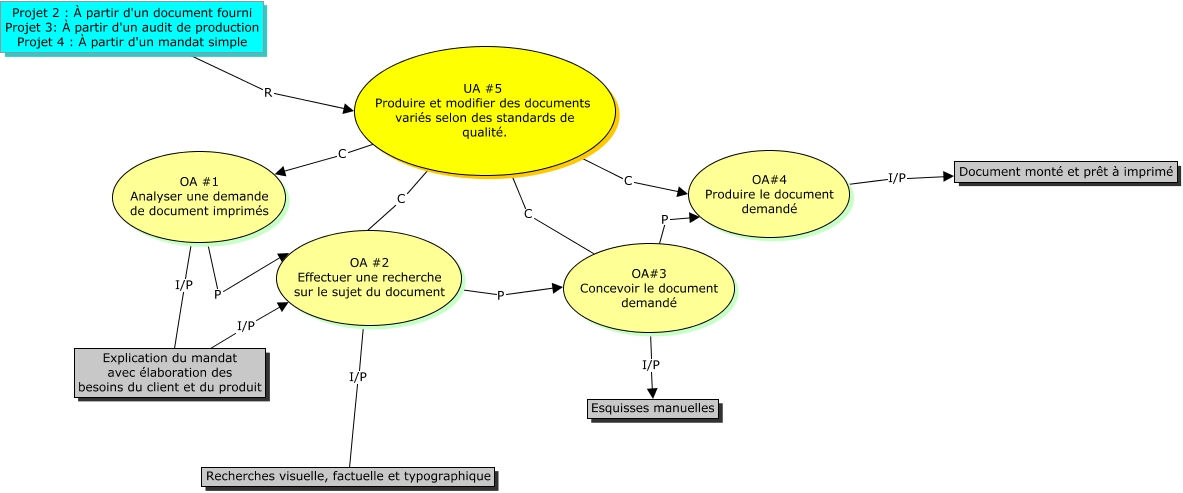 Cette carte de concepts créée avec IHMC CmapTools traite de: UA5, OA #2 Effectuer une recherche sur le sujet du document I/P Recherches visuelle, factuelle et typographique, Explication du mandat avec élaboration des besoins du client et du produit I/P OA #2 Effectuer une recherche sur le sujet du document, OA #1 Analyser une demande de document imprimés P OA #2 Effectuer une recherche sur le sujet du document, OA#4 Produire le document demandé I/P Document monté et prêt à imprimé, UA #5 Produire et modifier des documents variés selon des standards de qualité. C OA #2 Effectuer une recherche sur le sujet du document, UA #5 Produire et modifier des documents variés selon des standards de qualité. C OA#3 Concevoir le document demandé, UA #5 Produire et modifier des documents variés selon des standards de qualité. C OA#4 Produire le document demandé, OA #1 Analyser une demande de document imprimés I/P Explication du mandat avec élaboration des besoins du client et du produit, Projet 2 : À partir d'un document fourni Projet 3: À partir d'un audit de production Projet 4 : À partir d'un mandat simple R UA #5 Produire et modifier des documents variés selon des standards de qualité., OA #2 Effectuer une recherche sur le sujet du document P OA#3 Concevoir le document demandé, OA#3 Concevoir le document demandé P OA#4 Produire le document demandé, UA #5 Produire et modifier des documents variés selon des standards de qualité. C OA #1 Analyser une demande de document imprimés, OA#3 Concevoir le document demandé I/P Esquisses manuelles