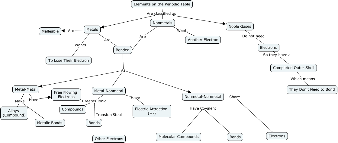 This Concept Map, created with IHMC CmapTools, has information related to: Types of Element Combination, Bonded As Metal-Metal, Elements on the Periodic Table Are classified as Noble Gases, Completed Outer Shell Which means They Don't Need to Bond, Electrons So they have a Completed Outer Shell, Metal-Metal Have Free Flowing Electrons, Noble Gases Do not need Electrons, Bonded As Nonmetal-Nonmetal, Nonmetals Wants Another Electron, Metal-Nonmetal Creates Ionic Compounds, Metal-Nonmetal Creates Ionic Bonds, Bonded As Metal-Nonmetal, Metal-Metal Make Alloys (Compound), Metal-Nonmetal Transfer/Steal Other Electrons, Nonmetal-Nonmetal Share Electrons, Elements on the Periodic Table Are classified as Nonmetals, Nonmetal-Nonmetal Have Covalent Molecular Compounds, Metals Are Bonded, Metal-Nonmetal Have Electric Attraction (+-), Metals Are Malleable, Nonmetal-Nonmetal Have Covalent Bonds