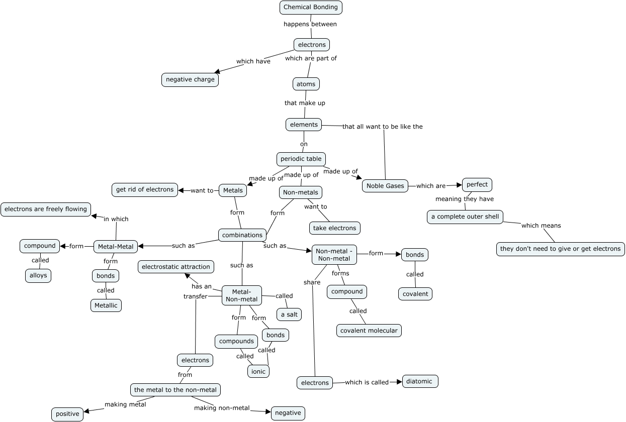This Concept Map, created with IHMC CmapTools, has information related to: Chemical Bonding, bonds called ionic, periodic table made up of Metals, Non-metal - Non-metal share electrons, Metal- Non-metal transfer electrons, Metal-Metal form compound, Non-metal - Non-metal form bonds, elements that all want to be like the Noble Gases, Metal- Non-metal form compounds, perfect meaning they have a complete outer shell, the metal to the non-metal making metal positive, periodic table made up of Non-metals, Metals form combinations, Noble Gases which are perfect, periodic table made up of Noble Gases, electrons from the metal to the non-metal, electrons which is called diatomic, combinations such as Metal- Non-metal, the metal to the non-metal making non-metal negative, bonds called Metallic, Metals want to get rid of electrons