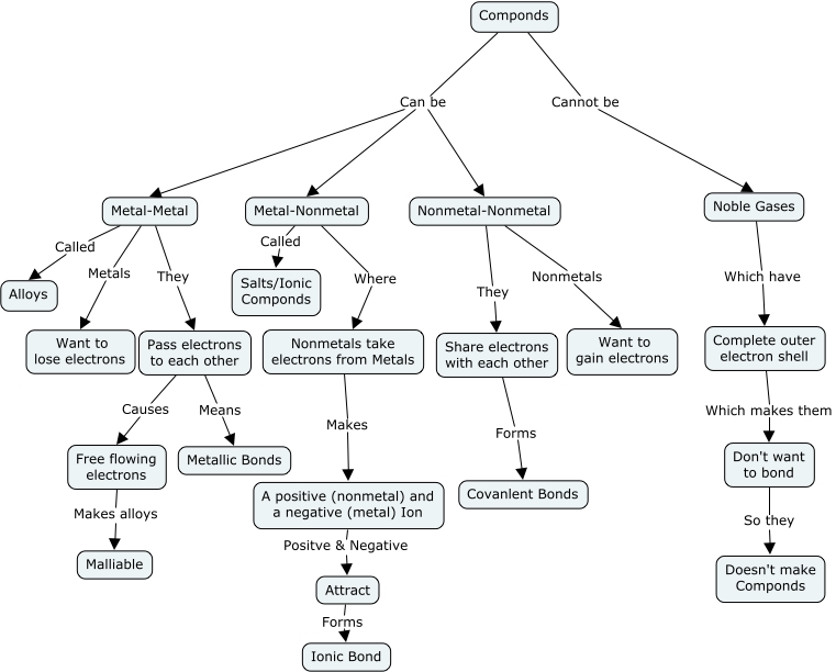 This Concept Map, created with IHMC CmapTools, has information related to: Types of Componds, Free flowing electrons Makes alloys Malliable, Componds Can be Nonmetal-Nonmetal, Pass electrons to each other Means Metallic Bonds, Metal-Metal Metals Want to lose electrons, Metal-Nonmetal Called Salts/Ionic Componds, Don't want to bond So they Doesn't make Componds, Metal-Nonmetal Where Nonmetals take electrons from Metals, Pass electrons to each other Causes Free flowing electrons, Componds Can be Metal-Nonmetal, Metal-Metal Called Alloys, A positive (nonmetal) and a negative (metal) Ion Positve & Negative Attract, Complete outer electron shell Which makes them Don't want to bond, Nonmetals take electrons from Metals Makes A positive (nonmetal) and a negative (metal) Ion, Attract Forms Ionic Bond, Share electrons with each other Forms Covanlent Bonds, Nonmetal-Nonmetal Nonmetals Want to gain electrons, Metal-Metal They Pass electrons to each other, Nonmetal-Nonmetal They Share electrons with each other, Componds Can be Metal-Metal, Componds Cannot be Noble Gases