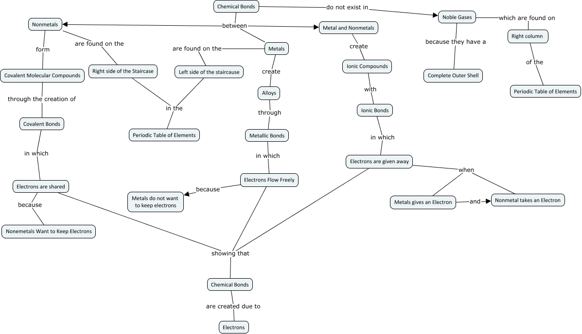 This Concept Map, created with IHMC CmapTools, has information related to: Chemical Bonding, Metallic Bonds in which Electrons Flow Freely, Metals are found on the Left side of the staircause, Nonmetals form Covalent Molecular Compounds, Electrons are given away when Metals gives an Electron, Chemical Bonds between Metals, Right column of the Periodic Table of Elements, Chemical Bonds between Metal and Nonmetals, Electrons are shared because Nonemetals Want to Keep Electrons, Chemical Bonds between Nonmetals, Noble Gases which are found on Right column, Covalent Bonds in which Electrons are shared, Chemical Bonds do not exist in Noble Gases, Electrons Flow Freely showing that Chemical Bonds, Alloys through Metallic Bonds, Metal and Nonmetals create Ionic Compounds, Electrons are shared showing that Chemical Bonds, Right side of the Staircase in the Periodic Table of Elements, Electrons are given away showing that Chemical Bonds, Noble Gases because they have a Complete Outer Shell, Nonmetals are found on the Right side of the Staircase