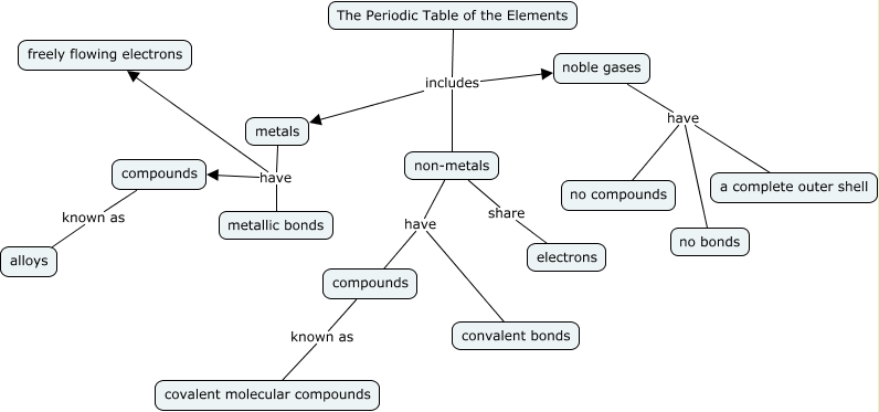 This Concept Map, created with IHMC CmapTools, has information related to: Chemical Bonding, metals have compounds, non-metals share electrons, The Periodic Table of the Elements includes non-metals, non-metals have compounds, noble gases have no bonds, noble gases have a complete outer shell, The Periodic Table of the Elements includes metals, non-metals have convalent bonds, metals have freely flowing electrons, The Periodic Table of the Elements includes noble gases, compounds known as covalent molecular compounds, compounds known as alloys, noble gases have no compounds, metals have metallic bonds