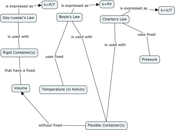 This Concept Map, created with IHMC CmapTools, has information related to: Gas Laws, Charles's Law is used with Flexible Container(s), Gay-Lussac's Law is used with Rigid Container(s), Boyle's Law is used with Flexible Container(s), Charles's Law is expressed as k=V/T, Charles's Law uses fixed Pressure, Boyle's Law is expressed as k=PV, Gay-Lussac's Law is expressed as k=P/T, Rigid Container(s) that have a fixed Volume, Flexible Container(s) without fixed Volume, Boyle's Law uses fixed Temperature (in Kelvin)