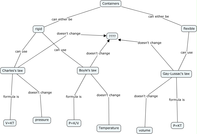 This Concept Map, created with IHMC CmapTools, has information related to: 3 laws, flexible can use Gay-Lussac's law, Charles's law formula is V=KT, Gay-Lussac's law doesn't change ????, Boyle's law doesn't change ????, Containers can either be rigid, rigid can use Boyle's law, rigid can use Charles's law, Boyle's law doesn't change Temperature, Containers can either be flexible, Charles's law doesn't change pressure, Boyle's law formula is P=K/V, Charles's law doesn't change ????, Gay-Lussac's law doesn't change volume, Gay-Lussac's law formula is P=KT