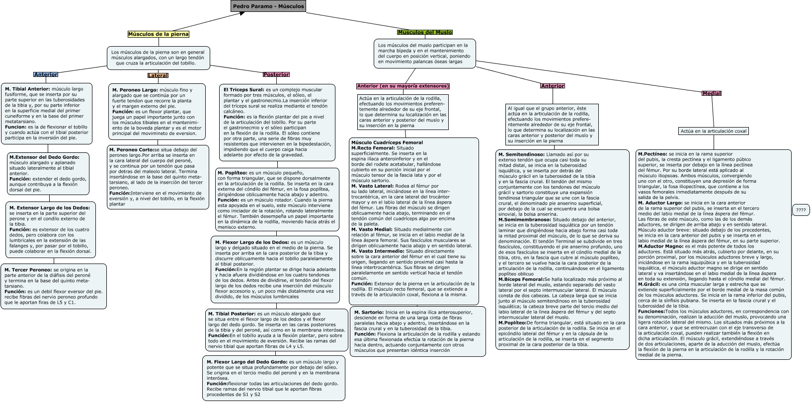 Este Cmap, tiene información relacionada con: PEDRO PARAMO MUSCULOS, M. Tibial Anterior: músculo largo fusiforme, que se inserta por su parte superior en las tuberosidades de la tibia y, por su parte inferior en la superficie medial del primer cuneiforme y en la base del primer metatarsiano. Funcion: es la de flexionar el tobillo y cuando actúa con el tibial posterior participa en la inversión del pie. M.Extensor del Dedo Gordo: músculo alargado y aplanado situado lateralmente al tibial anterior. Función: extender el dedo gordo, aunque contribuya a la flexión dorsal del pie. M. Extensor Largo de los Dedos: se inserta en la parte superior del perone y en el condilo externo de la tibia. Función: es extensor de los cuatro dedos, pero colabora con los lumbricales en la extensión de las falanges y, por pasar por el tobillo, puede colaborar en la flexión dorsal., Los músculos de la pierna son en general músculos alargados, con un largo tendón que cruza la articulación del tobillo. Lateral M. Peroneo Largo: músculo fino y alargado que se continúa por un fuerte tendon que recorre la planta y el margen externo del pie. Función: es un flexor plantar, que juega un papel importante junto con los músculos tibiales en el mantenimi- ento de la boveda plantar y es el motor principal del movimineto de eversion., M. Flexor Largo de los Dedos: es un músculo largo y delgado situado en el medio de la pierna. Se inserta por arriba en la cara posterior de la tibia y discurre oblicuamente hacia el tobillo paralelamente al tibial posterior. Función:En la región plantar se dirige hacia adelante y hacia afuera dividiéndose en los cuatro tendones de los dedos. Antes de dividirse, el tendón del flexor largo de los dedos recibe una inserción del músculo flexor accesorio y, un poco más distalmente una vez dividido, de los músculos lumbricales M. Tibial Posterior: es un músculo alargado que se situa entre el flexor largo de los dedos y el flexor largo del dedo gordo. Se inserta en las caras posteriores de la tibia y del peroné, así como en la membrana interósea. Función:En el tobillo ayuda a la flexión plantar, pero sobre todo en el movimiento de eversión. Recibe las ramas del nervio tibial que aportan fibras de L4 y L5. M. Flexor Largo del Dedo Gordo: es un músculo largo y potente que se situa profundamente por debajo del sóleo. Se origina en el tercio medio del peroné y en la membrana interósea. Función:flexionar todas las articulaciones del dedo gordo. Recibe ramas del nervio tibial que le aportan fibras procedentes de S1 y S2, El Triceps Sural: es un complejo muscular formado por tres músculos, el sóleo, el plantar y el gastronecmio.La inserción inferior del tríceps sural se realiza mediante el tendón calcáneo. Función: es la flexión plantar del pie a nivel de la articulación del tobillo. Por su parte el gastronecmio y el sóleo participan en la flexión de la rodilla. El sóleo contiene por otra parte, una serie de fibras muy resistentes que intervienen en la bipedestación, impidiendo que el cuerpo caiga hacia adelante por efecto de la gravedad. M. Poplíteo: es un músculo pequeño, con forma triangular, que se dispone dorsalmente en la articulación de la rodilla. Se inserta en la cara externa del cóndilo del fémur, en la fosa poplítea, dirigiéndose oblicuamente hacia abajo y adentro. Función: es un músculo rotador. Cuando la pierna esta apoyada en el suelo, este músculo interviene como iniciador de la rotación, rotando lateralmente el fémur. También desempeña un papel importante en la dinámica de la rodilla, moviendo hacia atrás el menisco externo. M. Flexor Largo de los Dedos: es un músculo largo y delgado situado en el medio de la pierna. Se inserta por arriba en la cara posterior de la tibia y discurre oblicuamente hacia el tobillo paralelamente al tibial posterior. Función:En la región plantar se dirige hacia adelante y hacia afuera dividiéndose en los cuatro tendones de los dedos. Antes de dividirse, el tendón del flexor largo de los dedos recibe una inserción del músculo flexor accesorio y, un poco más distalmente una vez dividido, de los músculos lumbricales, Actúa en la articulación coxal M.Pectíneo: se inicia en la rama superior del pubis, la cresta pectínea y el ligamento púbico superior, se inserta por debajo en la línea pectínea del fémur. Por su borde lateral está aplicado al músculo iliopsoas. Ambos músculos, convergiendo uno con el otro, constituyen una depresión de forma triangular, la fosa iliopectínea, que contiene a los vasos femorales inmediatamente después de su salida de la pelvis. M. Aductor Largo: se inicia en la cara anterior de la rama superior del pubis, se inserta en el tercero medio del labio medial de la línea áspera del fémur. Las fibras de este músculo, como las de los demás aductores, se dirigen de arriba abajo y en sentido lateral. Músculo aductor breve: situado debajo de los precedentes, se inicia en la cara anterior del pubis y se inserta en el labio medial de la línea áspera del fémur, en su parte superior. M.Aductor Magno: es el más potente de todos los aductores. Está situado más atrás, cubierto por delante, en su porción proximal, por los músculos aductores breve y largo, iniciándose en la rama isquipúbica y en la tuberosidad isquiática, el músculo aductor magno se dirige en sentido lateral y va insertándose en el labio medial de la línea áspera en toda su extensión, llegando hasta el cóndilo medial del fémur. M.Grácil: es una cinta muscular larga y estrecha que se extiende superficialmente por el borde medial de la masa común de los músculos aductores. Se inicia en la rama inferior del pubis, cerca de la sínfisis pubiana. Se inserta en la fascia crural y el tuberosidad de la tibia. Funciones:Todos los músculos aductores, en correspondencia con su denominación, realizan la aducción del muslo, provocando una ligera rotación lateral del mismo. Los situados m
