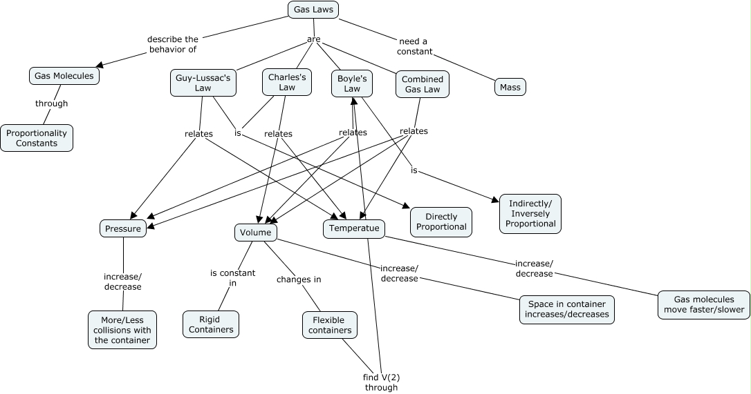 This Concept Map, created with IHMC CmapTools, has information related to: Gas Laws, Volume is constant in Rigid Containers, Volume increase/ decrease Space in container increases/decreases, Combined Gas Law relates Temperatue, Pressure increase/ decrease More/Less collisions with the container, Gas Laws are Combined Gas Law, Charles's Law relates Volume, Gas Laws are Charles's Law, Gas Laws need a constant Mass, Gas Molecules through Proportionality Constants, Charles's Law relates Temperatue, Charles's Law is Directly Proportional, Boyle's Law relates Volume, Gas Laws are Guy-Lussac's Law, Flexible containers find V(2) through Boyle's Law, Guy-Lussac's Law relates Temperatue, Boyle's Law is Indirectly/ Inversely Proportional, Temperatue increase/ decrease Gas molecules move faster/slower, Volume changes in Flexible containers, Boyle's Law relates Pressure, Guy-Lussac's Law is Directly Proportional