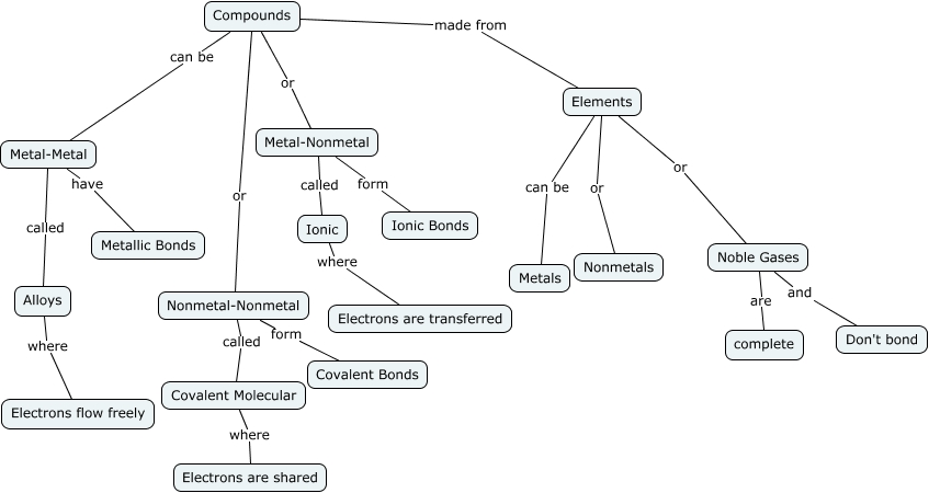 This Concept Map, created with IHMC CmapTools, has information related to: Chemical Bonding, Compounds can be Metal-Metal, Alloys where Electrons flow freely, Noble Gases and Don't bond, Metal-Nonmetal called Ionic, Compounds made from Elements, Noble Gases are complete, Metal-Nonmetal form Ionic Bonds, Metal-Metal have Metallic Bonds, Elements or Noble Gases, Elements or Nonmetals, Ionic where Electrons are transferred, Nonmetal-Nonmetal called Covalent Molecular, Metal-Metal called Alloys, Covalent Molecular where Electrons are shared, Compounds or Nonmetal-Nonmetal, Nonmetal-Nonmetal form Covalent Bonds, Elements can be Metals, Compounds or Metal-Nonmetal