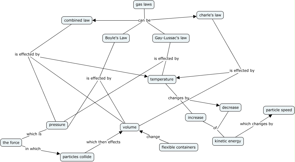 This Concept Map, created with IHMC CmapTools, has information related to: gas laws, charle's law is effected by temperature, increase of kinetic energy, combined law is effected by pressure, temperature changes by decrease, Gay-Lussac's law is effected by pressure, particles collide which then effects volume, gas laws can be charle's law, gas laws can be Boyle's Law, combined law is effected by temperature, decrease of kinetic energy, gas laws can be combined law, the force in which particles collide, kinetic energy which changes by particle speed, pressure which is the force, charle's law is effected by volume, Boyle's Law is effected by volume, Boyle's Law is effected by pressure, temperature changes by increase, gas laws can be Gay-Lussac's law, combined law is effected by volume