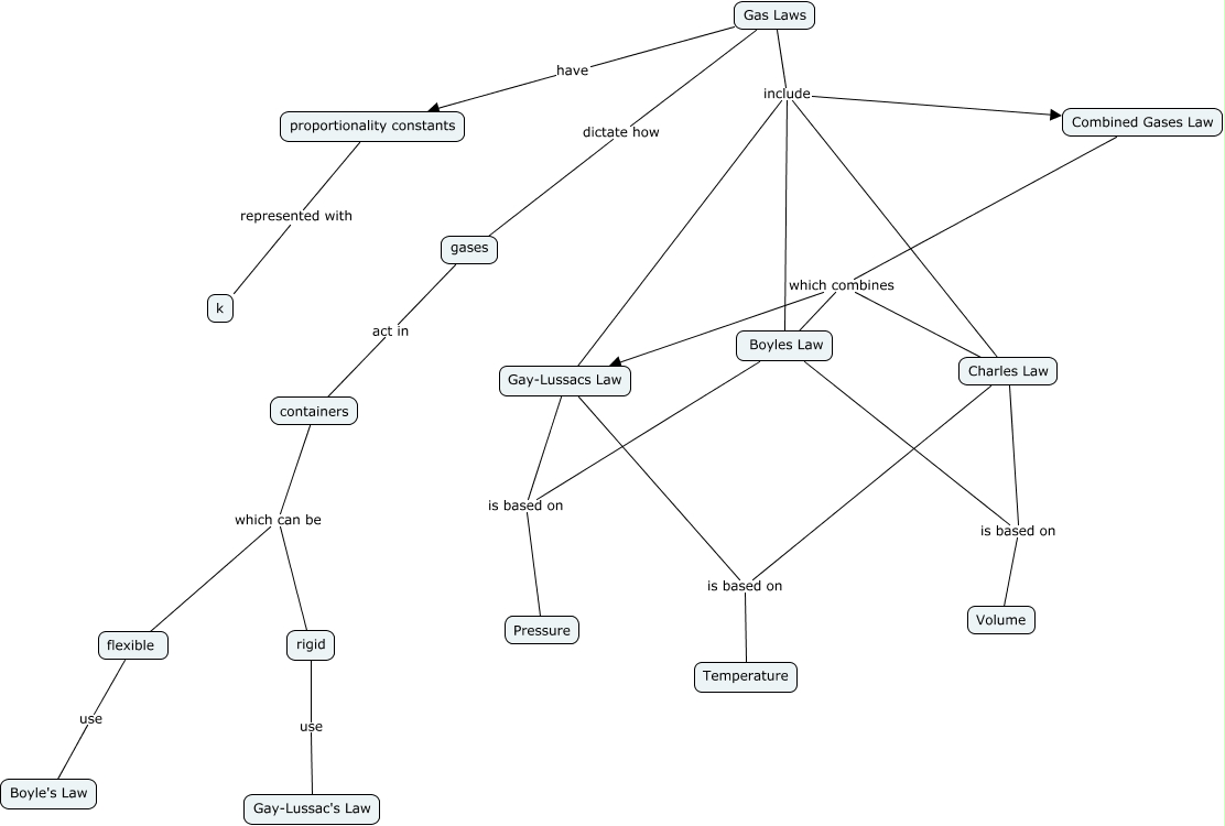 This Concept Map, created with IHMC CmapTools, has information related to: Gas Laws, Charles Law is based on Volume, flexible use Boyle's Law, Gay-Lussacs Law is based on Temperature, Boyles Law which combines Gay-Lussacs Law, Gas Laws include Charles Law, Charles Law is based on Temperature, Boyles Law is based on Volume, gases act in containers, Gay-Lussacs Law is based on Pressure, Boyles Law is based on Pressure, Gas Laws include Gay-Lussacs Law, Gas Laws include Boyles Law, rigid use Gay-Lussac's Law, Gas Laws include Combined Gases Law, Gas Laws dictate how gases, Combined Gases Law which combines Gay-Lussacs Law, containers which can be rigid, containers which can be flexible, Gas Laws have proportionality constants, proportionality constants represented with k