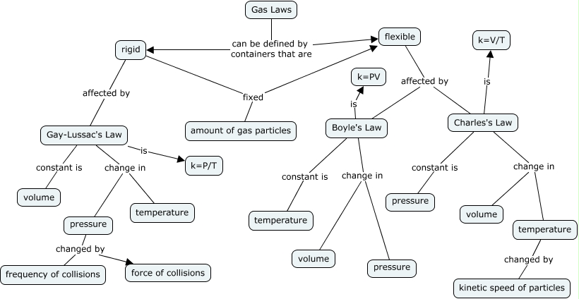 This Concept Map, created with IHMC CmapTools, has information related to: Gas Laws, flexible affected by Boyle's Law, Boyle's Law change in pressure, Boyle's Law change in volume, Gas Laws can be defined by containers that are rigid, Boyle's Law constant is temperature, temperature changed by kinetic speed of particles, rigid fixed flexible, Gay-Lussac's Law is k=P/T, Charles's Law change in temperature, Gay-Lussac's Law change in temperature, Charles's Law is k=V/T, Gas Laws can be defined by containers that are flexible, Charles's Law constant is pressure, Boyle's Law is k=PV, rigid affected by Gay-Lussac's Law, flexible affected by Charles's Law, Gay-Lussac's Law constant is volume, pressure changed by force of collisions, pressure changed by frequency of collisions, Gay-Lussac's Law change in pressure