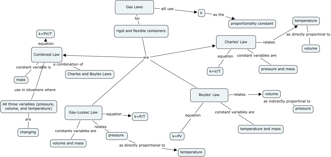 This Concept Map, created with IHMC CmapTools, has information related to: Gas Laws, Combined Law equation k=PV/T, Gas Laws alll use k, rigid and flexible containers are Combined Law, Gas Laws for rigid and flexible containers, Combined Law a combination of Charles and Boyles Laws, rigid and flexible containers are Boyles' Law, volume as indirectly proportinal to pressure, k as the proportionality constant, Charles' Law relates temperature, Gay-Lussac Law equation k=P/T, Gay-Lussac Law relates pressure, Boyles' Law equation k=PV, pressure as directly proportional to temperature, Combined Law use in situations where All three variables (pressure, volume, and temperature), Charles' Law equation k=V/T, Boyles' Law relates volume, All three variables (pressure, volume, and temperature) are changing, Charles' Law constant variables are pressure and mass, Boyles' Law constant variables are temperature and mass, Gay-Lussac Law constants variables are volume and mass