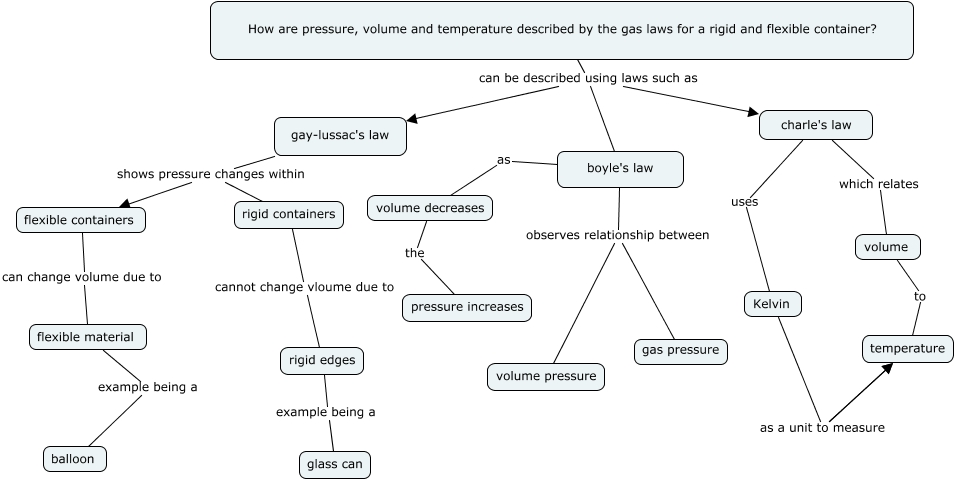 This Concept Map, created with IHMC CmapTools, has information related to: Gas Law's, charle's law uses Kelvin, Kelvin as a unit to measure temperature, How are pressure, volume and temperature described by the gas laws for a rigid and flexible container? can be described using laws such as gay-lussac's law, boyle's law observes relationship between gas pressure, Kelvin as a unit to measure temperature, volume to temperature, How are pressure, volume and temperature described by the gas laws for a rigid and flexible container? can be described using laws such as boyle's law, charle's law which relates volume, volume decreases the pressure increases, gay-lussac's law shows pressure changes within flexible containers, rigid containers cannot change vloume due to rigid edges, flexible material example being a balloon, boyle's law as volume decreases, rigid edges example being a glass can, gay-lussac's law shows pressure changes within rigid containers, flexible containers can change volume due to flexible material, How are pressure, volume and temperature described by the gas laws for a rigid and flexible container? can be described using laws such as charle's law, boyle's law observes relationship between volume pressure