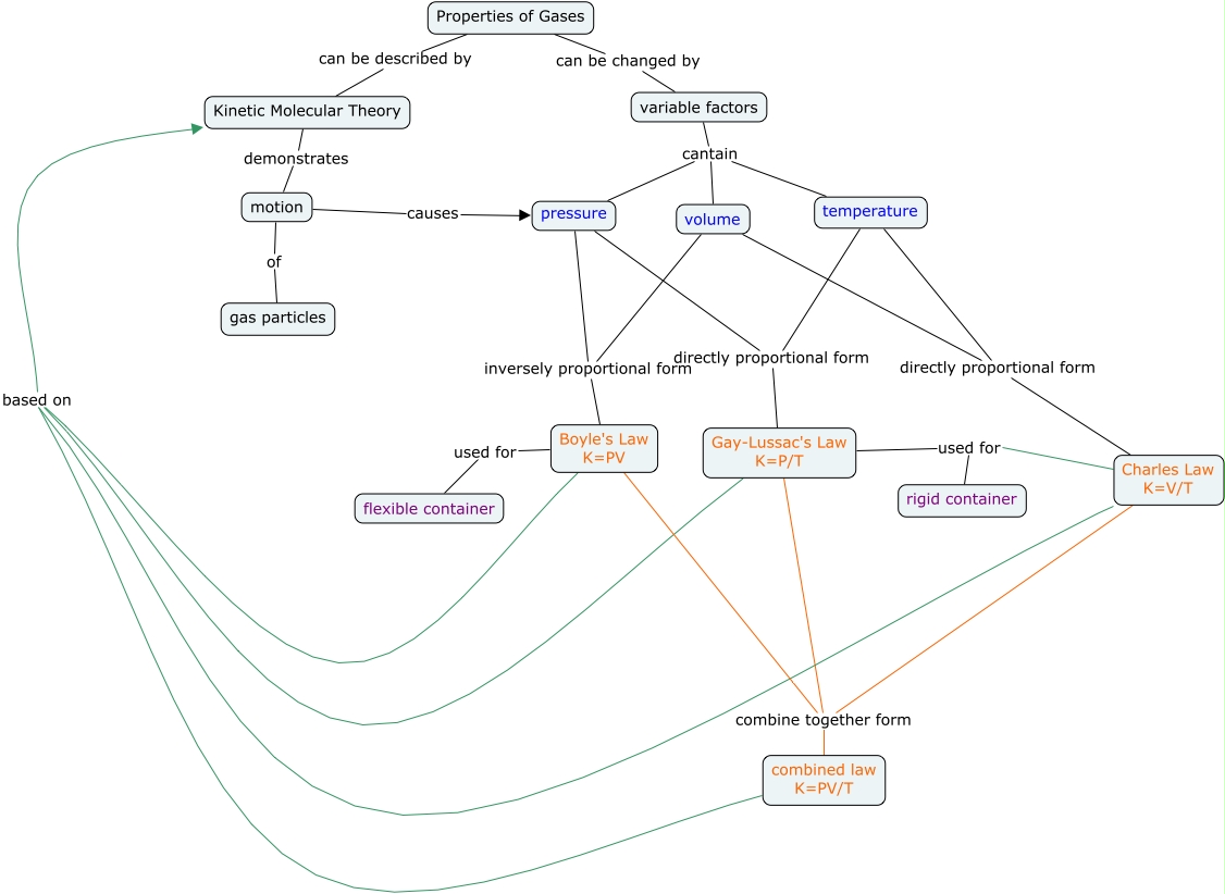 This Concept Map, created with IHMC CmapTools, has information related to: Gas Laws, volume directly proportional form Charles Law K=V/T, Boyle's Law K=PV used for flexible container, Kinetic Molecular Theory demonstrates motion, combined law K=PV/T based on Kinetic Molecular Theory, volume inversely proportional form Boyle's Law K=PV, Boyle's Law K=PV combine together form combined law K=PV/T, Charles Law K=V/T used for rigid container, Properties of Gases can be described by Kinetic Molecular Theory, pressure directly proportional form Gay-Lussac's Law K=P/T, variable factors cantain pressure, variable factors cantain volume, Gay-Lussac's Law K=P/T based on Kinetic Molecular Theory, variable factors cantain temperature, pressure inversely proportional form Boyle's Law K=PV, temperature directly proportional form Charles Law K=V/T, Charles Law K=V/T based on Kinetic Molecular Theory, Properties of Gases can be changed by variable factors, temperature directly proportional form Gay-Lussac's Law K=P/T, Boyle's Law K=PV based on Kinetic Molecular Theory, motion causes pressure