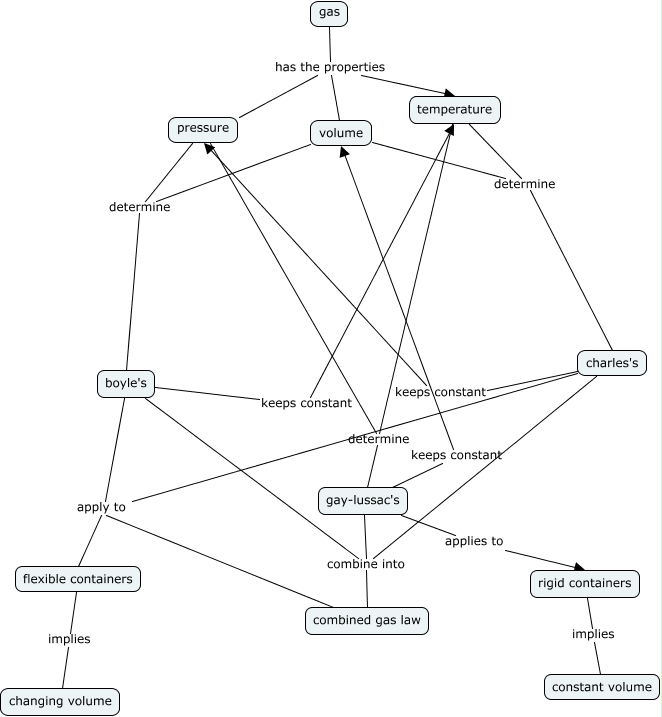 This Concept Map, created with IHMC CmapTools, has information related to: gas laws and containers, rigid containers implies constant volume, gay-lussac's keeps constant volume, gay-lussac's combine into combined gas law, volume determine boyle's, pressure determine gay-lussac's, temperature determine charles's, boyle's combine into combined gas law, charles's combine into combined gas law, boyle's keeps constant temperature, gay-lussac's applies to rigid containers, flexible containers implies changing volume, volume determine charles's, temperature determine gay-lussac's, pressure determine boyle's, boyle's apply to flexible containers, combined gas law apply to flexible containers, charles's apply to flexible containers, gas has the properties pressure, charles's keeps constant pressure, gas has the properties temperature
