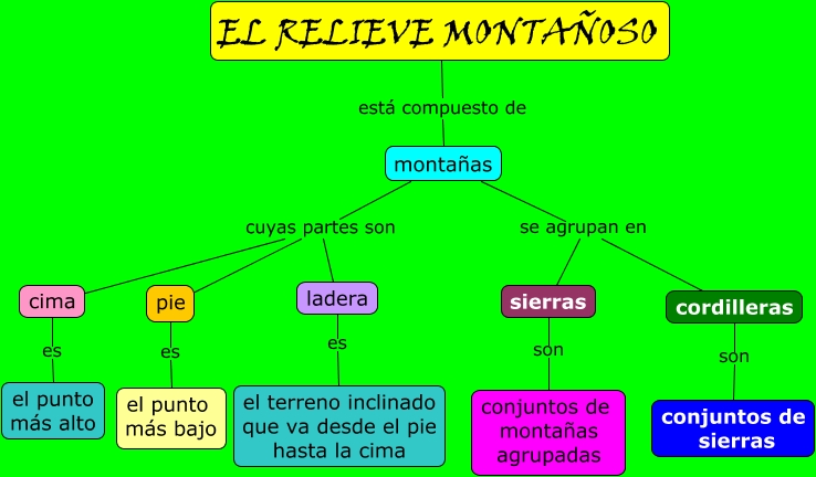 Este Cmap, tiene información relacionada con: El relieve montañoso, EL RELIEVE MONTAÑOSO está compuesto de montañas, ladera es el terreno inclinado que va desde el pie hasta la cima, cima es el punto más alto, montañas cuyas partes son ladera, pie es el punto más bajo, montañas se agrupan en cordilleras, cordilleras son conjuntos de sierras, montañas cuyas partes son pie, sierras son conjuntos de montañas agrupadas, montañas se agrupan en sierras, montañas cuyas partes son cima