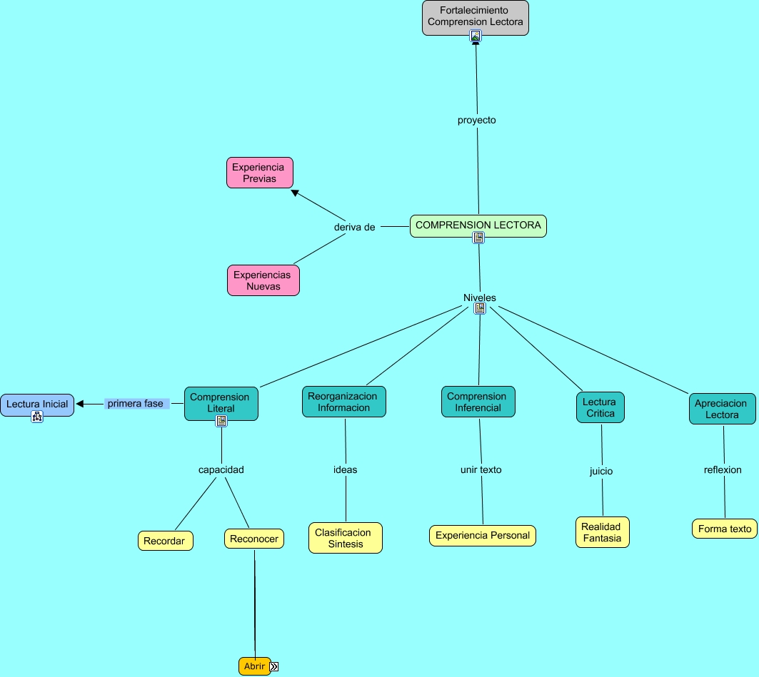 Este Cmap, tiene información relacionada con: COMPRENSION LECTORA, Comprension Literal capacidad Recordar, Apreciacion Lectora reflexion Forma texto, Reconocer relaciona Causa Efectos, Comprension Literal primera fase Lectura Inicial, Lectura Critica juicio Realidad Fantasia, Reconocer identifica Secuencias Hechos, Comprension Inferencial unir texto Experiencia Personal, Reconocer observa Detalles, COMPRENSION LECTORA deriva de Experiencia Previas, Reconocer Identifica Nombres Personajes Lugares Tiempos, COMPRENSION LECTORA Niveles Comprension Literal, COMPRENSION LECTORA deriva de Experiencias Nuevas, Reorganizacion Informacion ideas Clasificacion Sintesis, Comprension Literal capacidad Reconocer, COMPRENSION LECTORA Niveles Apreciacion Lectora, COMPRENSION LECTORA Niveles Comprension Inferencial, Reconocer encuentra Idea Principal, COMPRENSION LECTORA Niveles Lectura Critica, COMPRENSION LECTORA proyecto Fortalecimiento Comprension Lectora, COMPRENSION LECTORA Niveles Reorganizacion Informacion
